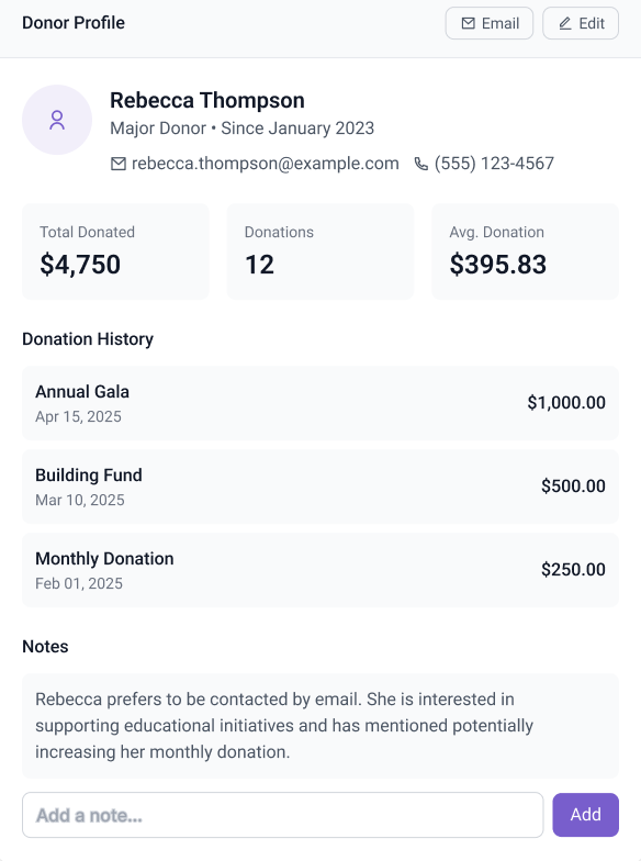 Everything you need to track, manage, and engage with your donors effectively.