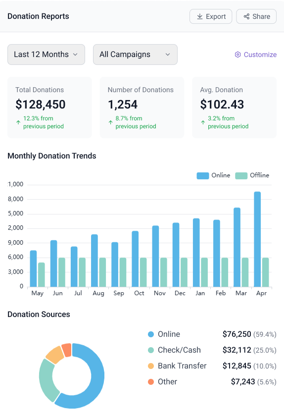Generate comprehensive reports on your fundraising efforts. Get insights into your donor base and campaign performance.