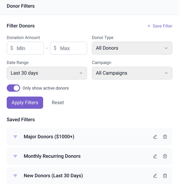 Save your commonly used filters for quick access to your segmented donor lists.